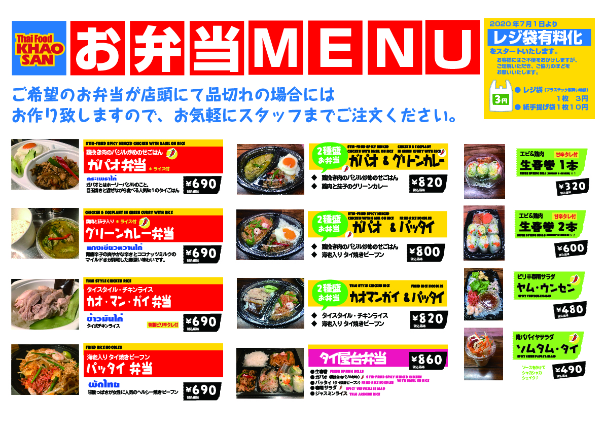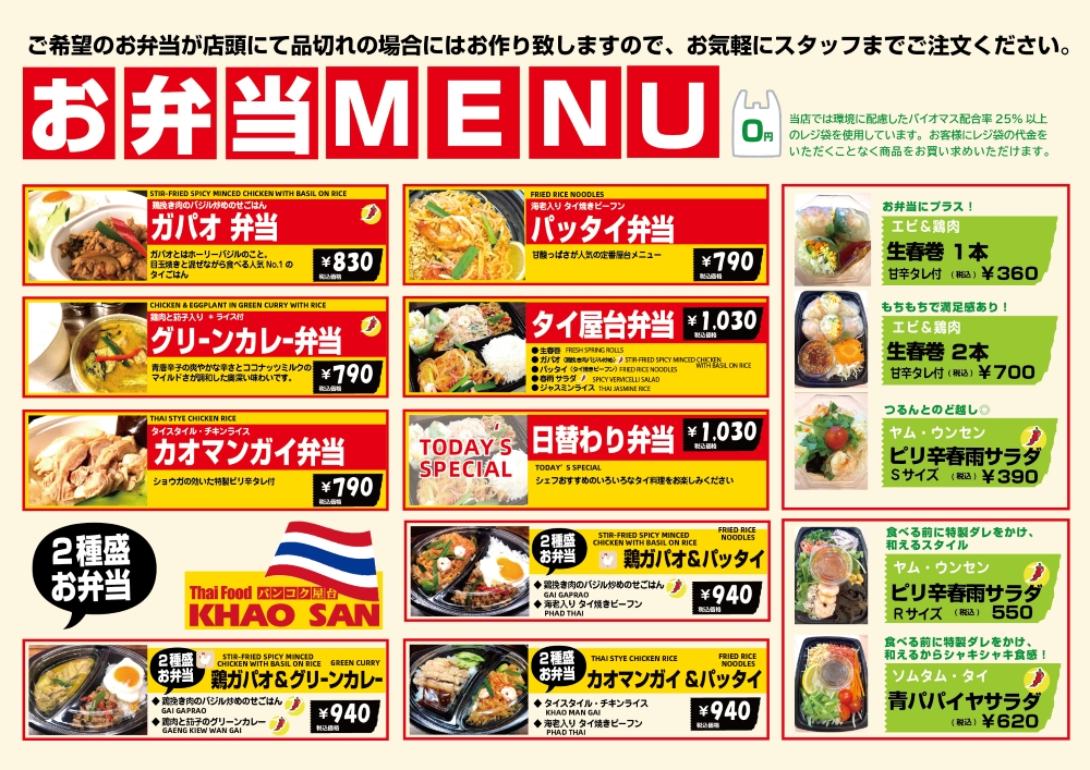 セットメニューはディナータイムも O K なので、いつでも、少人数でも気軽にタイ料理を楽しめる店! 自慢の味「タイ式トムヤムヌードル」は当店オリジナル! あっさりスープに桜エビ、砕いたピーナッツ、チリパウダーがクセになります。 ヌードルの他、タイサラダ、鶏肉グリル、炒めもの、海老のすり身揚げetc.etc. タイ人シェフが腕を振るう本格タイ料理をお楽しみください! ![]() 店頭に並ぶ「タイのお弁当・お惣菜」で、おうちでタイパーティもおすすめ!