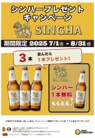 シンハープレゼントキャンペーン 瓶ビール3本(シンハー生3杯)ご注文で1本プレゼント 期間:2025年7月1日(火)~8月31日(日) 対象店舗 ・ティーヌン西早稲田本店 ・ティーヌン市ヶ谷...
